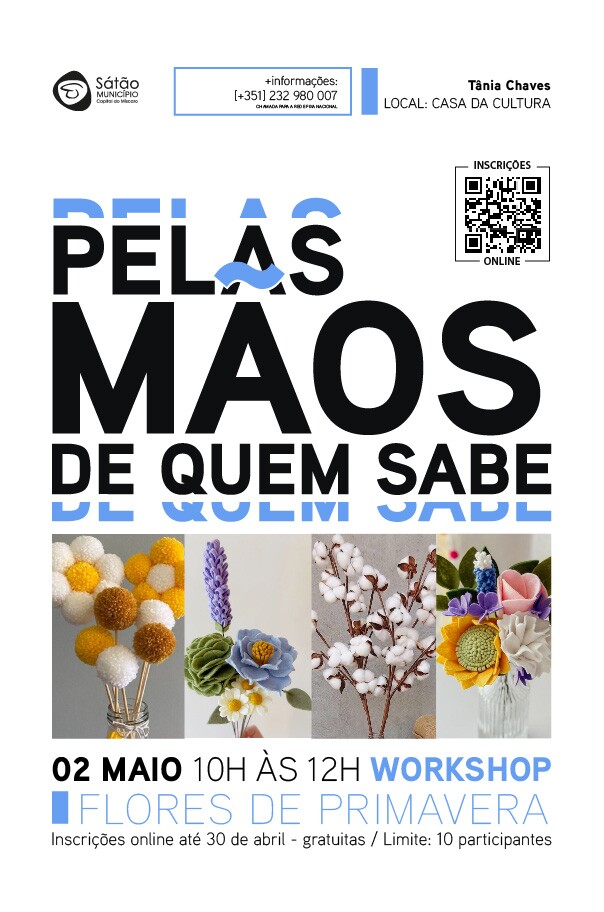 No âmbito da iniciativa “Pelas mãos de quem sabe”, vai decorrer no dia 02 de maio de 2026, sábado, entre as 10h00 e as 12h00, na Casa da Cultura de Sátão, o workshop “Flores de Primavera”, com Tânia Chaves.