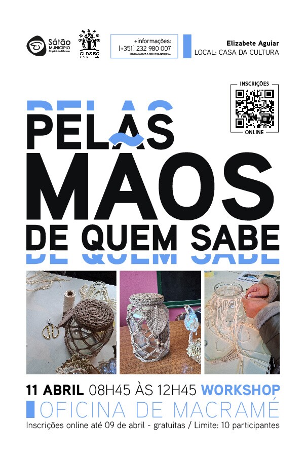 No âmbito da iniciativa “Pelas mãos de quem sabe” e com a colaboração do CLDS 5G de Sátão, vai decorrer no dia 11 de abril de 2026, sábado, entre as 08h45 e as 12h45, na Casa da Cultura de Sátão, o workshop "Oficina de Macramé”, com Elizabete Aguiar.
