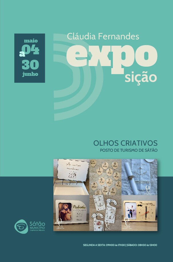 O Posto de Turismo de Sátão recebe a exposição “Olhos Criativos”, de Cláudia Fernandes, de 04 de maio a 30 de junho de 2026.