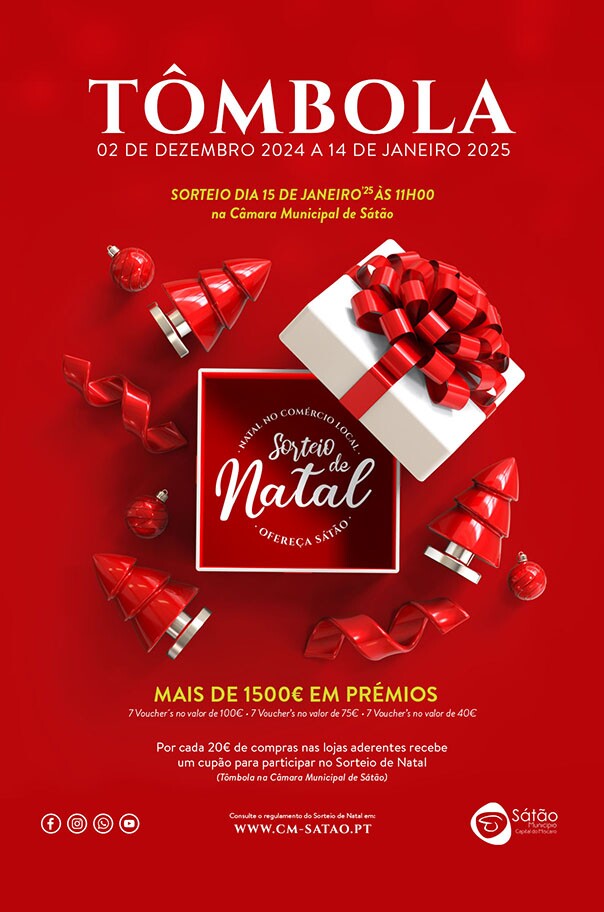Para incentivar e revitalizar o comércio local na época natalícia, o Município de Sátão convida os consumidores a participarem na 4ª edição do concurso "Natal no Comércio Local – Ofereça Sátão". Ao fazerem compras nas lojas do concelho, entre o dia 2 de dezembro de 2024 e 10 de janeiro de 2025, por cada 20 euros de compras nos estabelecimentos aderentes, os consumidores terão direito a um cupão, que os habilita a prémios, com um valor total de mais de 1.500,00 euros.