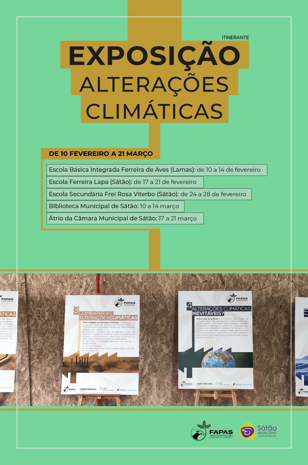 Durante os meses de fevereiro e março, o Município de Sátão, em colaboração com a FAPAS (Associação Portuguesa para a Conservação da Natureza) e o Agrupamento de Escolas de Sátão, promoverá uma exposição temática sobre as alterações climáticas, em algumas escolas do concelho.