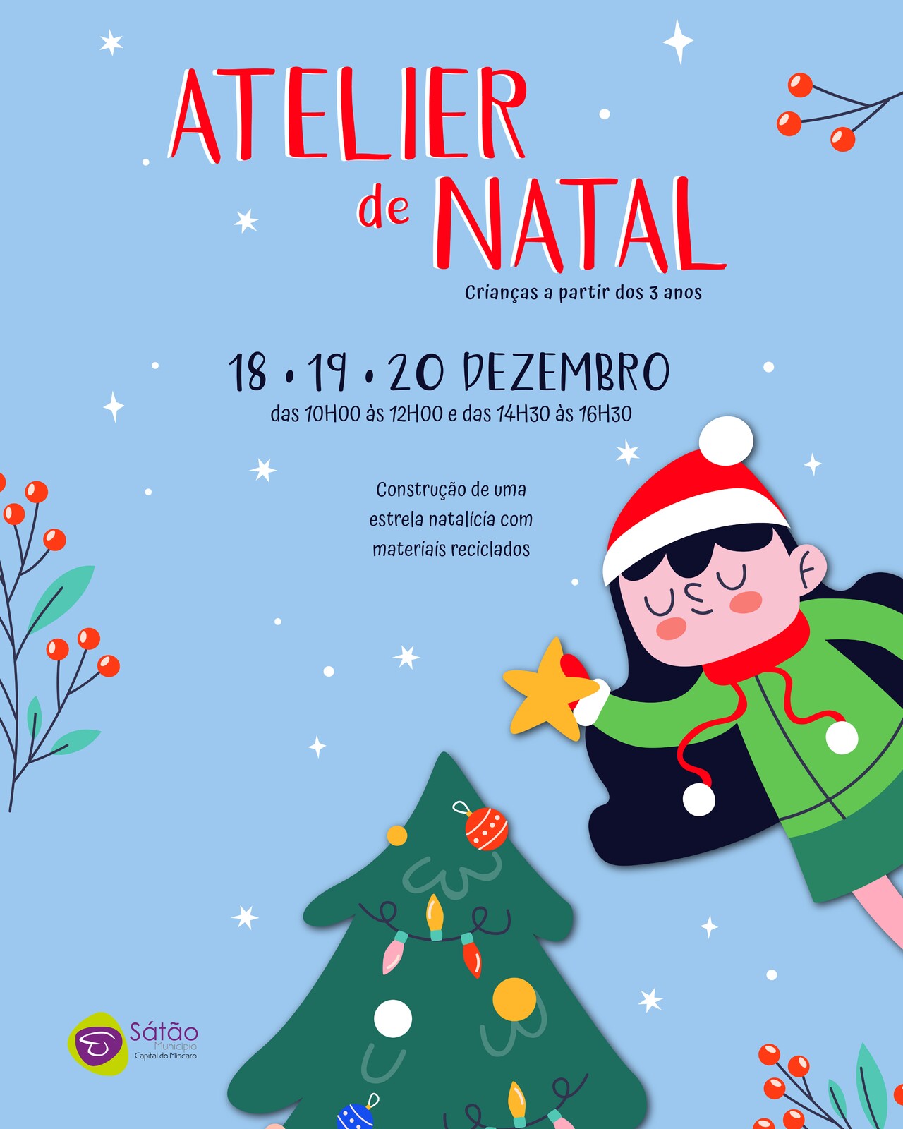 A Biblioteca Municipal de Sátão está envolta no espírito natalício e prepara-se para receber, nos dias 18, 19 e 20 de dezembro de 2023, das 10h00 às 12h00 e das 14h30 às 16h30, as crianças com mais de 3 anos de idade. As crianças vão ter a oportunidade de dar asas à imaginação e participar no Atelier de Natal, onde vão construir uma estrela natalícia com materiais reciclados.