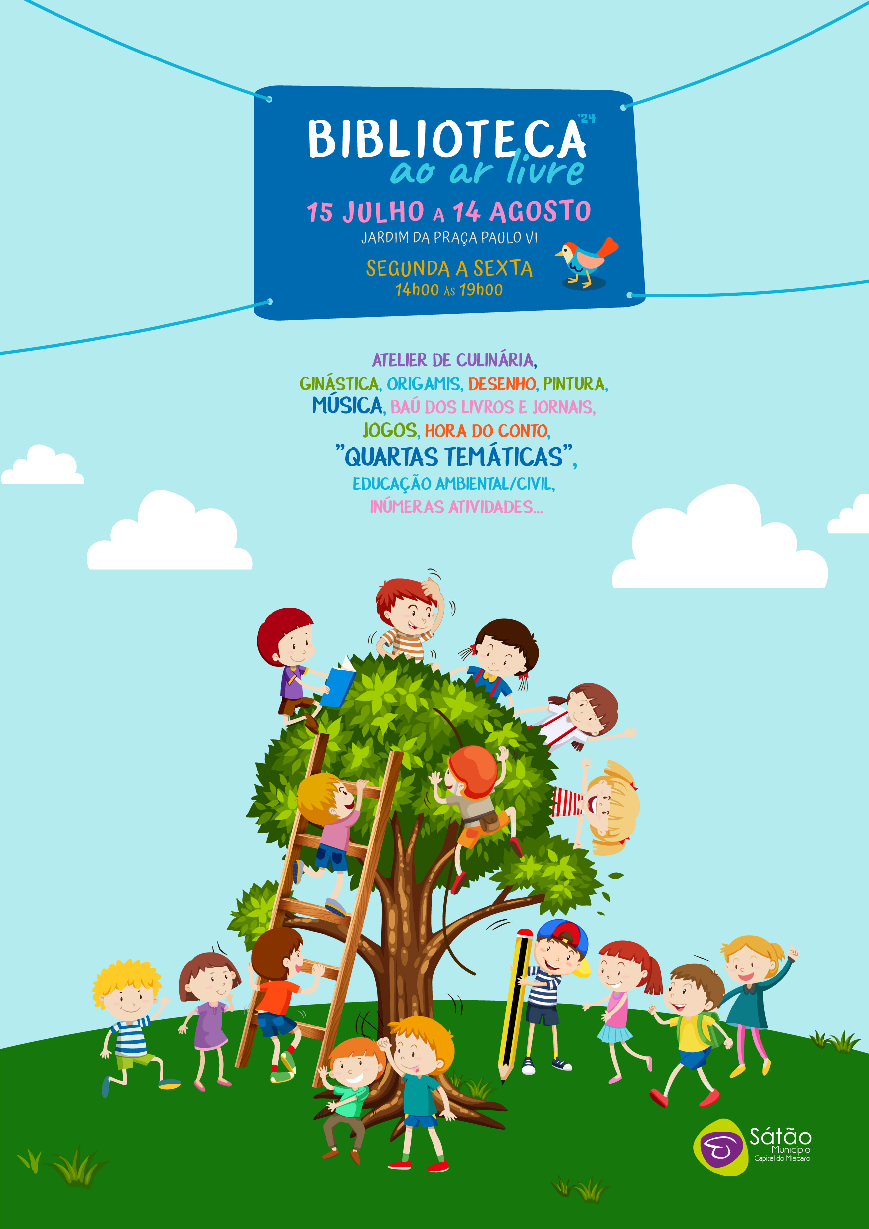 Desde o dia 15 de julho até ao dia 14 de agosto de 2024, no Jardim da Praça Paulo VI, das 14h00 às 19h00, de segunda a sexta-feira, crianças, jovens e adultos, podem usufruir gratuitamente das iniciativas propostas, com destaque para as quartas-feiras, onde haverá uma temática diferente, com inscrição prévia para participação (no local ou através do número 232980000 – chamada para a rede fixa nacional – até à segunda-feira anterior). A sombra das árvores, o chilrear dos passarinhos e o ar puro que se faz sentir, serão a companhia de quem quiser desfrutar deste ambiente agradável.