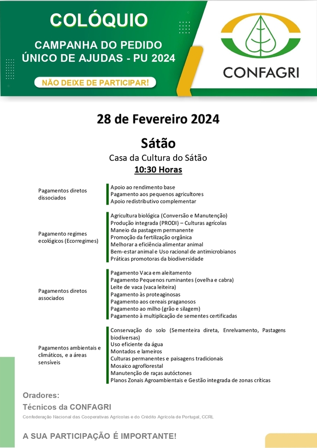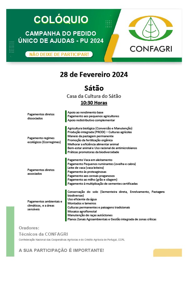 Adicionar a calendário2024-02-28 00:00:002024-02-28 00:00:00Europe/LisbonColóquio: campanha do Pedido Único de Ajudas - PU 2024A sua participação é importante!Casa da Cultura de SátãoConfragi - Câmara Municipal de Sátão
