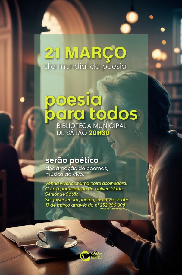 A Biblioteca Municipal de Sátão vai comemorar o Dia Mundial da Poesia no próximo dia 21 de março, às 20h30, com um evento especial e acolhedor que contará com a participação da Universidade Sénior de Sátão e está aberto a todos os interessados em partilhar e vivenciar a magia da poesia.