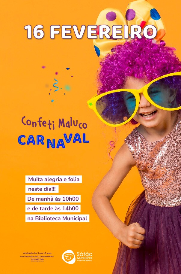 A Biblioteca Municipal de Sátão vai assinalar a época do Carnaval com a realização da atividade “Confeti Maluco”, no dia 16 de fevereiro de 2026 (segunda-feira), às 10h00 e às 14h00, direcionada às crianças dos 3 aos 10 anos.