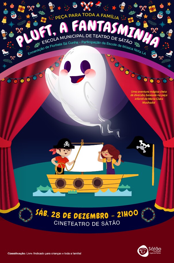 O grupo júnior da Escola Municipal de Teatro de Sátão vai apresentar no dia 28 de dezembro de 2024, sábado, às 21h00, no Cineteatro Municipal de Sátão, a peça de teatro para toda a família “Pluft, a Fantasminha”, escrita pela dramaturga brasileira Maria Clara Machado, em 1955, com encenação de Florbela Sá Cunha. Esta peça terá a participação da Escola de Música Nota LA.