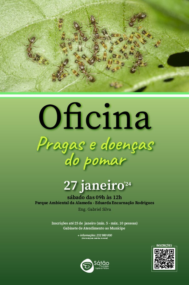 No próximo dia 27 de janeiro de 2024, sábado, a Câmara Municipal de Sátão promove no Parque Ambiental da Alameda Eduarda da Encarnação Rodrigues, a oficina “Pragas e doenças do pomar”, ministrada por Eng. Gabriel Silva, das 09h00 às 12h00.