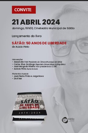No dia 21 de abril, às 16h00, no Cineteatro Municipal decorre o lançamento do livro “Sátão: 50 anos de Liberdade”, do autor Acácio Pinto, que contará com as intervenções de Alexandre Vaz, Presidente da Câmara Municipal de Sátão; Carlos Silva Santiago, Deputado à Assembleia da República; José Morgado Ribeiro, Vice-Presidente da CCDRC e do autor do livro, Acácio Pinto. Os momentos musicais estarão a cargo de José Pedro Pinto e Jorge Novo e do Grupo ZAATAM.