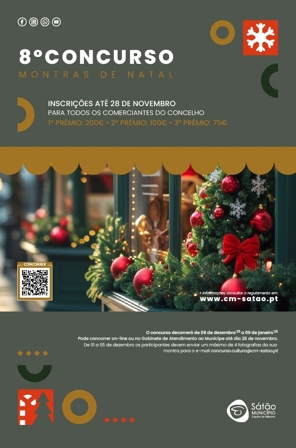 Com a chegada da época natalícia e para valorizar o comércio local, trazer mais encanto às ruas e dar um toque especial e festivo ao concelho, o Município de Sátão promove a 8ª Edição do Concurso de Montras de Natal. As inscrições decorrem até ao dia 28 de novembro, para todos os comerciantes do concelho com montra visível a partir do espaço público. As votações do público são de 08 de dezembro a 09 de janeiro de 2026. As inscrições devem ser realizadas online, através do preenchimento do formulário disponível aqui ou presencialmente no Gabinete de Atendimento ao Munícipe. Para mais informações, os interessados devem consultar o regulamento.