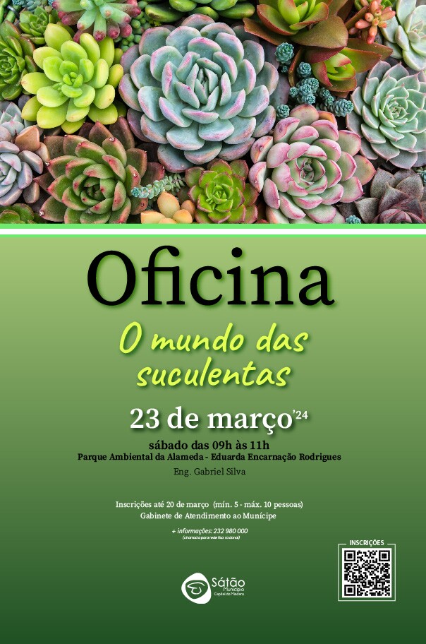“Esculturas vivas”, os catos e suculentas podem ser encontrados em várias regiões do globo, apresentando diferentes tamanhos, formas, flores e caráter. A sua baixa necessidade de manutenção, faz destas plantas “um belíssimo símbolo de resistência e força”. Com esta oficina, pretende-se apresentar de forma simples: Quais os principais tipos? Qual a diferença entre catos e suculentas? Como se plantam e transplantam? É verdade que não se devem regar? Eis algumas das dúvidas que serão esclarecidas no decorrer desta sessão. Inscreva-se! Venha maravilhar-se com o fantástico mundo das suculentas!