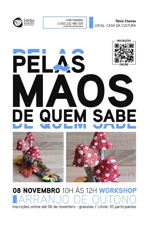 No âmbito da iniciativa “Pelas mãos de quem sabe”, vai decorrer no dia 08 de novembro de 2025, sábado, entre as 10h00 e as 12h00, na Casa da Cultura de Sátão, o workshop “Arranjo de Outono”, com Tânia Chaves.