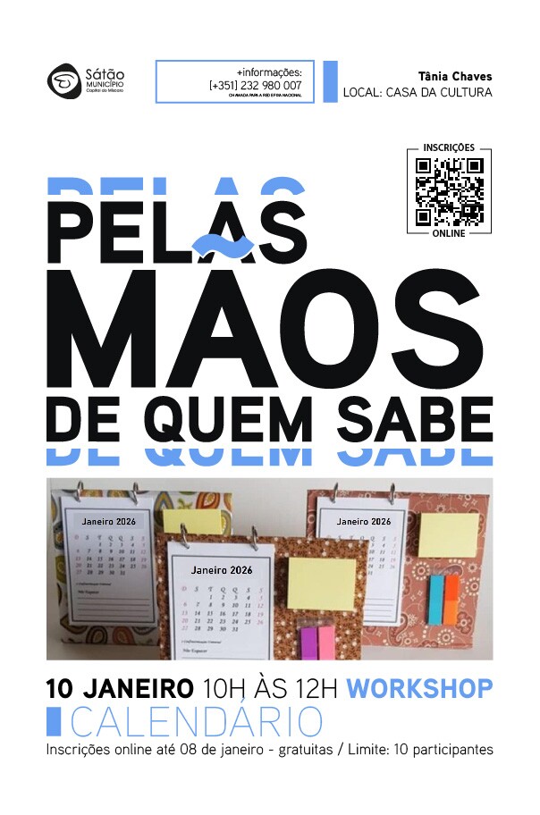 No âmbito da iniciativa “Pelas mãos de quem sabe”, vai decorrer no dia 10 de janeiro de 2026, sábado, entre as 10h00 e as 12h00, na Casa da Cultura de Sátão, o workshop “Calendário”, com Tânia Chaves.