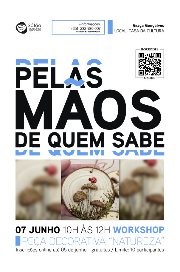 No âmbito da iniciativa “Pelas mãos de quem sabe”, vai decorrer no dia 07 de junho de 2025, sábado, entre as 10h00 e as 12h00, na Casa da Cultura de Sátão, o workshop “Peça decorativa - Natureza”, com a artesã Graça Gonçalves.