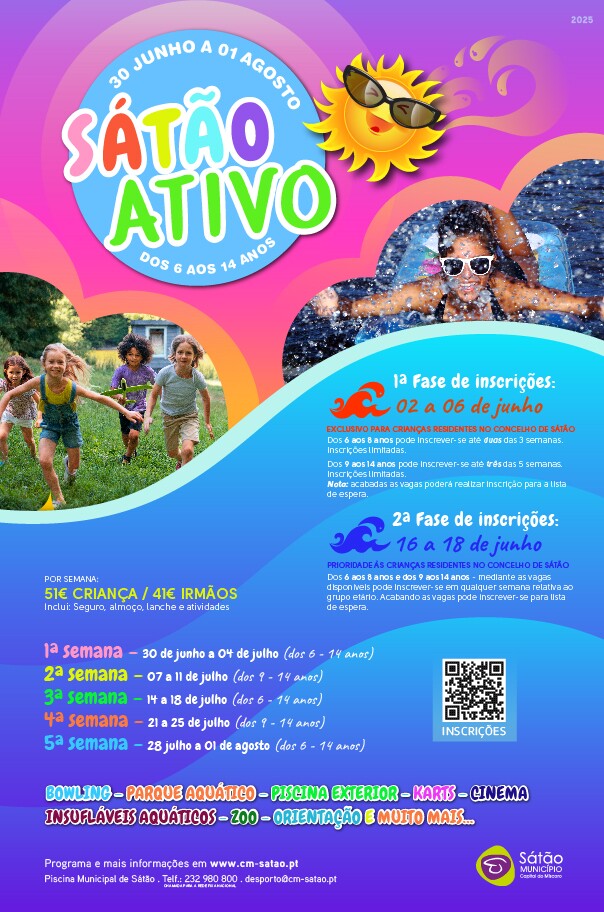 O Município de Sátão apresenta a iniciativa Sátão Ativo 2025 de 30 de junho a 01 de agosto, para jovens dos 06 aos 14 anos.