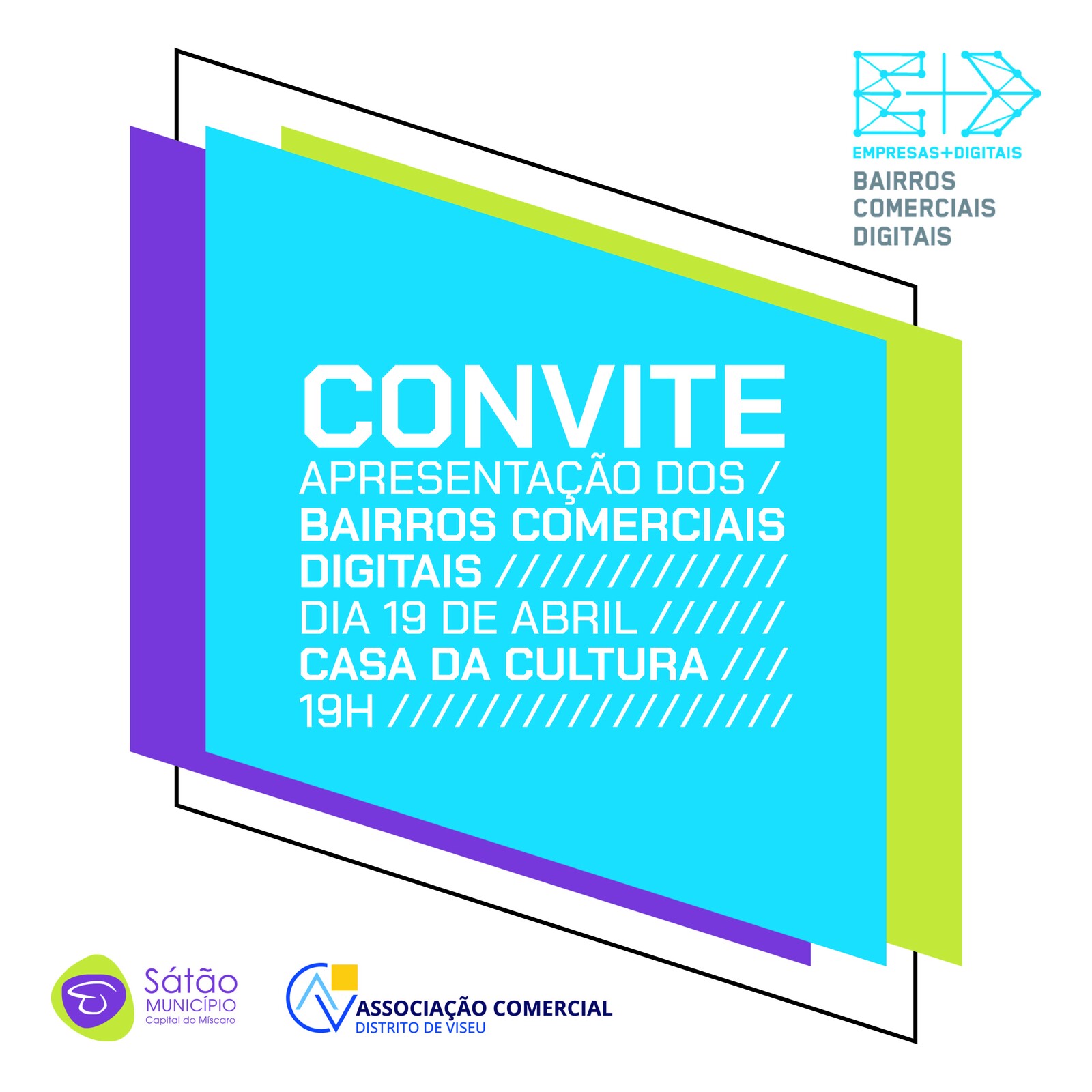 O Município de Sátão convida todos os interessados para a sessão de apresentação dos Bairros Comerciais Digitais, no próximo dia 19 de abril pelas 19h00 na Casa da Cultura de Sátão.