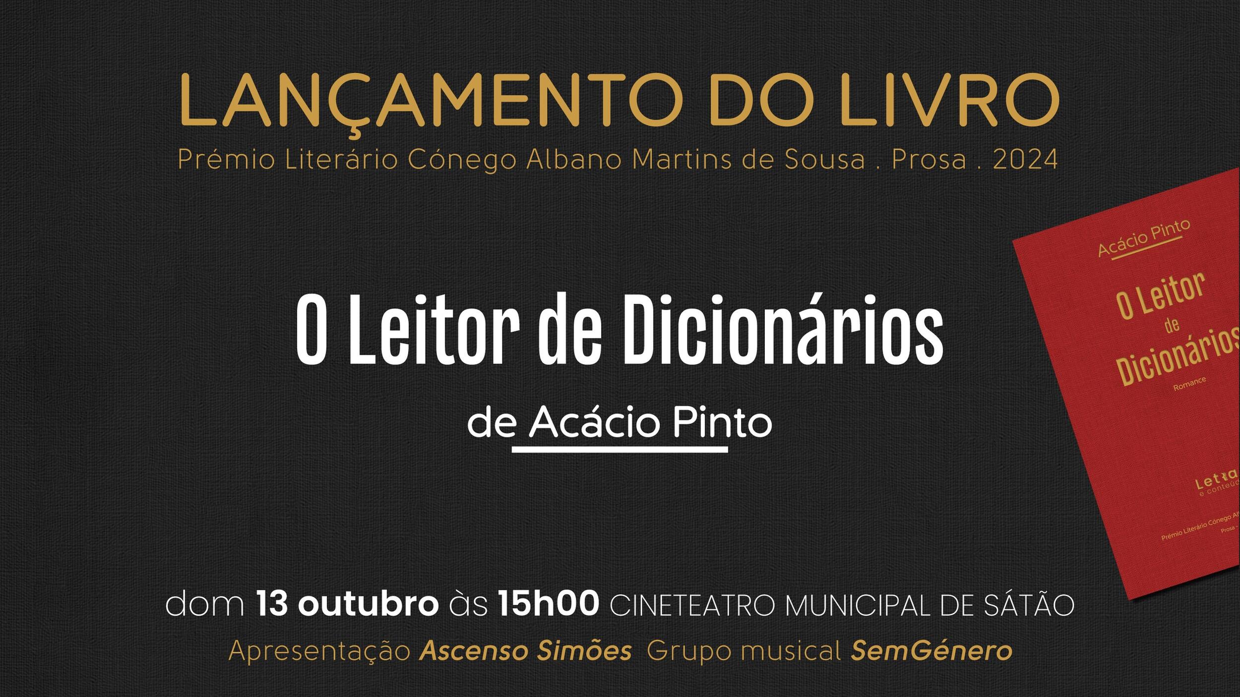 Com a sala do Cineteatro Municipal de Sátão praticamente lotada, decorreu no dia 13 de outubro, a sessão de lançamento do livro “O Leitor de Dicionários”, de Acácio Pinto. Este romance vem no seguimento do Prémio Literário “Cónego Albano Martins de Sousa” do ano de 2024, onde Acácio Pinto se sagrou vencedor, na modalidade de prosa.