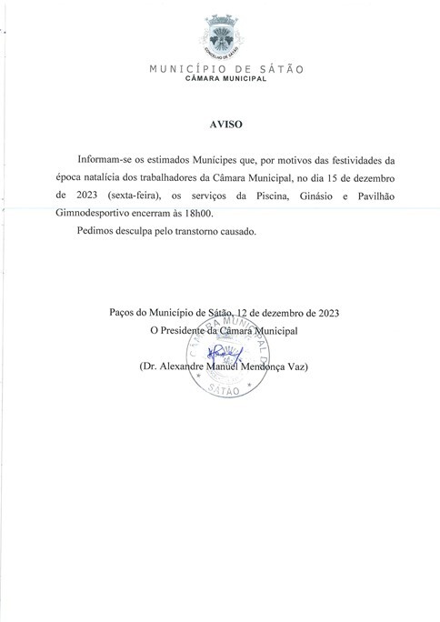 Aviso - Encerramento das Piscinas Municipais de 15 a 23 de dezembro