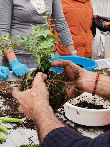 Ao longo da manhã, as 11 participantes tiveram a oportunidade de conhecer esta técnica milenar e de fazer um kokedama. Foram identificadas algumas espécies que podem ser usadas e os principais cuidados e tipo de manutenção associada a esta técnica.