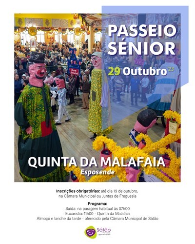 O Município de Sátão assinala o Dia Internacional do Idoso e oferece um passeio totalmente gratuito no dia 29 de outubro de 2023, domingo, a todos os idosos do Concelho a partir dos 65 anos de idade, tendo como destino a Quinta da Malafaia (Esposende).