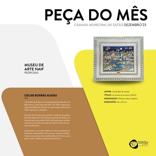 No mês de dezembro, em exposição no átrio do edifício da Câmara Municipal, a Peça do Mês é um quadro de Arte Naïf, do autor Oscar Borrás Ausías , intitulado “La noche em la nieve” e que irá fazer parte do espólio do futuro Museu de Arte Naïf do concelho de Sátão.