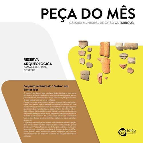 No mês de outubro, em exposição no átrio do edifício da Câmara Municipal, a Peça do Mês é um conjunto cerâmico do “Castro” dos Santos Idos, da Reserva Arqueológica.