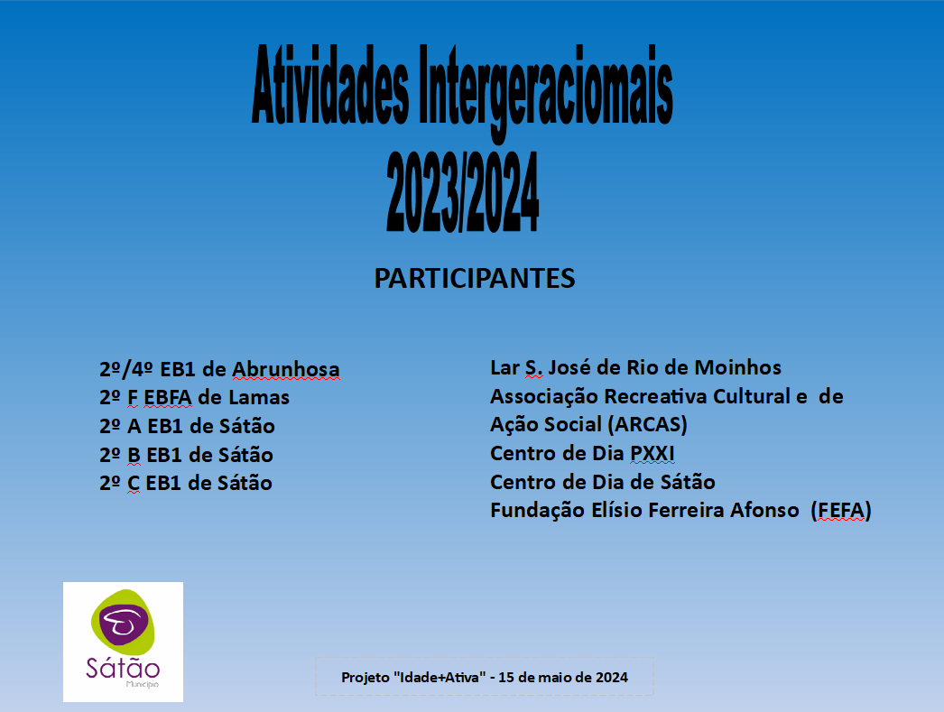 No dia 15 de maio, também no âmbito do Projeto Idade + Ativa, decorreu um espetáculo com as crianças do 2º ano do Agrupamento de Escolas de Sátão e os seniores das instituições de solidariedade social do concelho de Sátão. Este convívio salutar permitiu a interação entre gerações tão diferentes.
