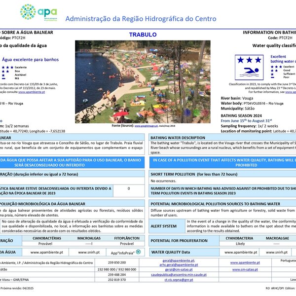 12 Junho 2024Informação sobre a qualidade da água balnear da Praia Fluvial do Trabulo