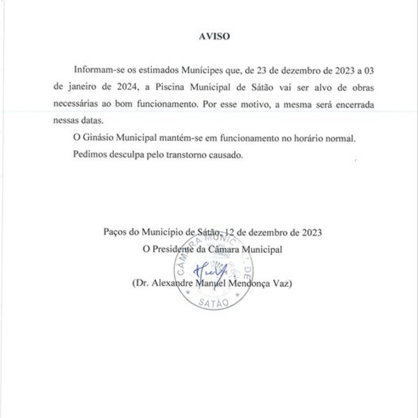 14 Dezembro 2023Aviso - Piscinas e Pavilhão 15 de dezembro