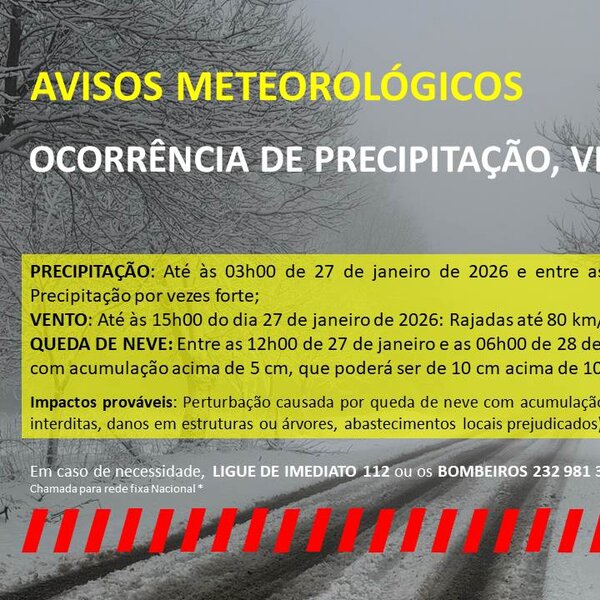 26 Janeiro 2026Aviso Meteorológico - Ocorrência de precipitação, vento e neve