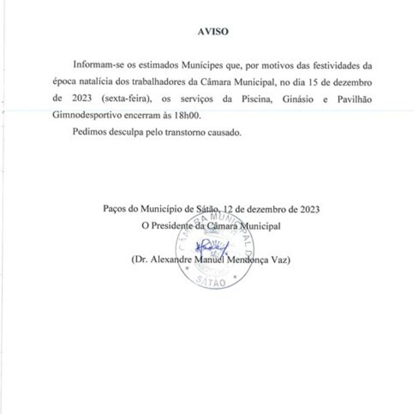 13 Dezembro 2023Aviso - Encerramento das Piscinas Municipais de 15 a 23 de dezembro